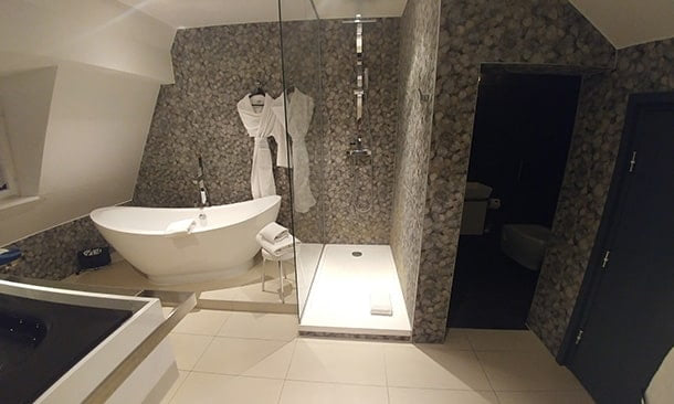 - Salle de bains avec douche à l’italienne, baignoire en îlot, wc isolés, produits d’accueil, peignoirs, sèche-cheveux